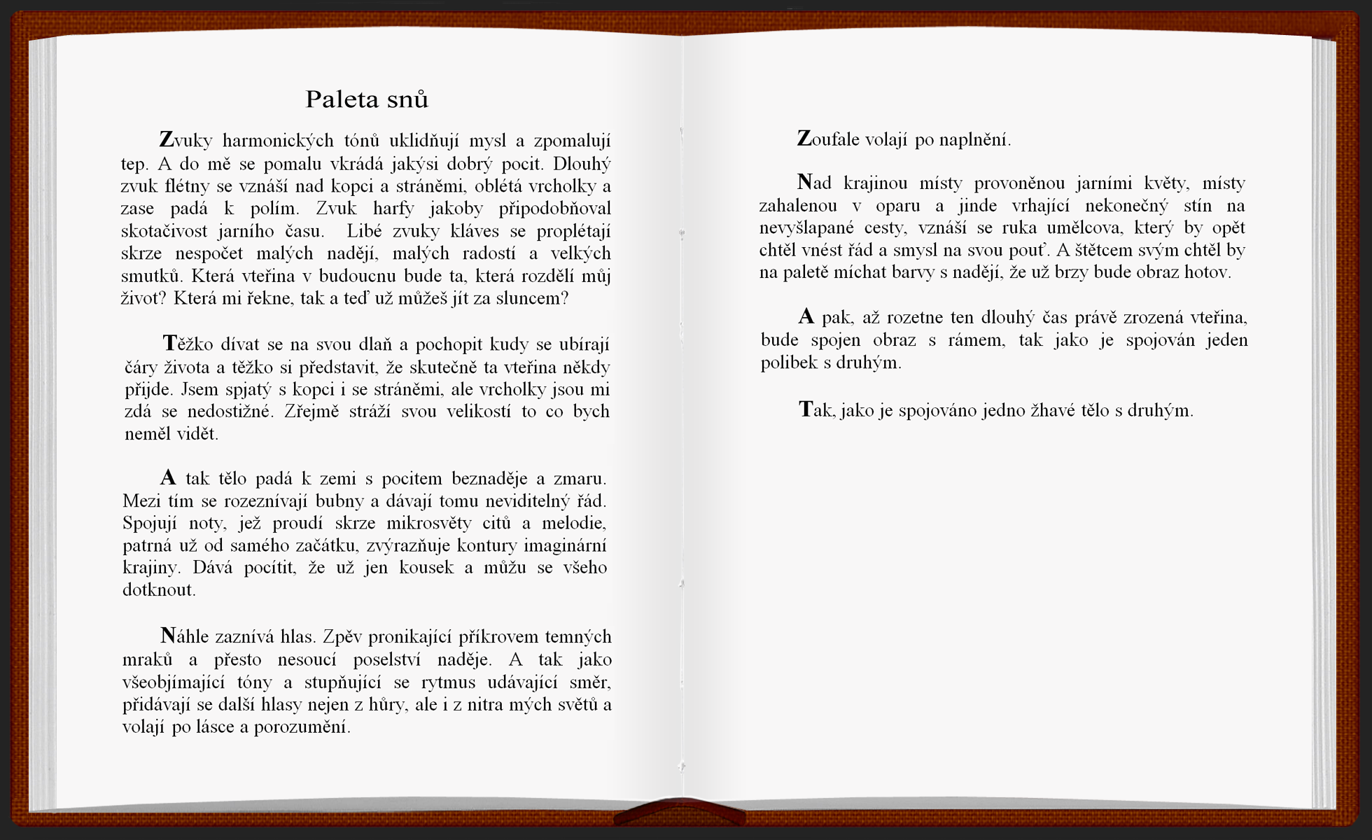Velmi mě baví "psát", hrát si slovy a vytvářet texty a spisoviny, které mají příběh, nějakou myšlenku. Které vycházejí z mého života, z mých zážitků a pocitů.